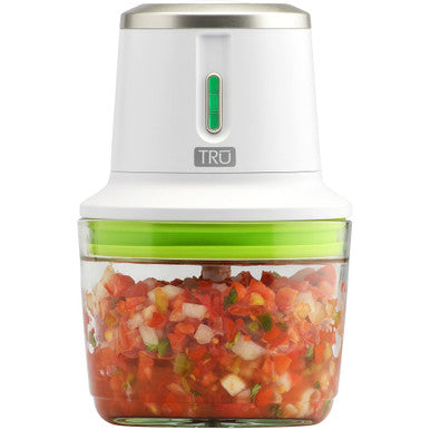 Cordless technology for on-the-go convenience. The TRU Cordless Rechargeable 2 Speed Chopper will quickly become a favorite food prep appliance. No more hovering around an electrical outlet while creating in the kitchen or out and about. Gain the freedom to move without the tangle and restriction of an electrical cord. Powered by a 7.4 volt lithium-ion battery, this cordless chopper packs as much power as its corded counterparts and features long lasting run times. The 3½ cup (28 oz) durable glass bowl is BPA-free and dishwasher safe. Designed to tackle any food prep task, the multi-plane stainless steel blade is ideal to mince, dice, chop, blend and puree fresh ingredients. The power bar indicates the remaining battery level. A single charge can operate for up to 30 minutes. When it's time to recharge, attach the included charging cord and return to full battery power in under 4 hours.
