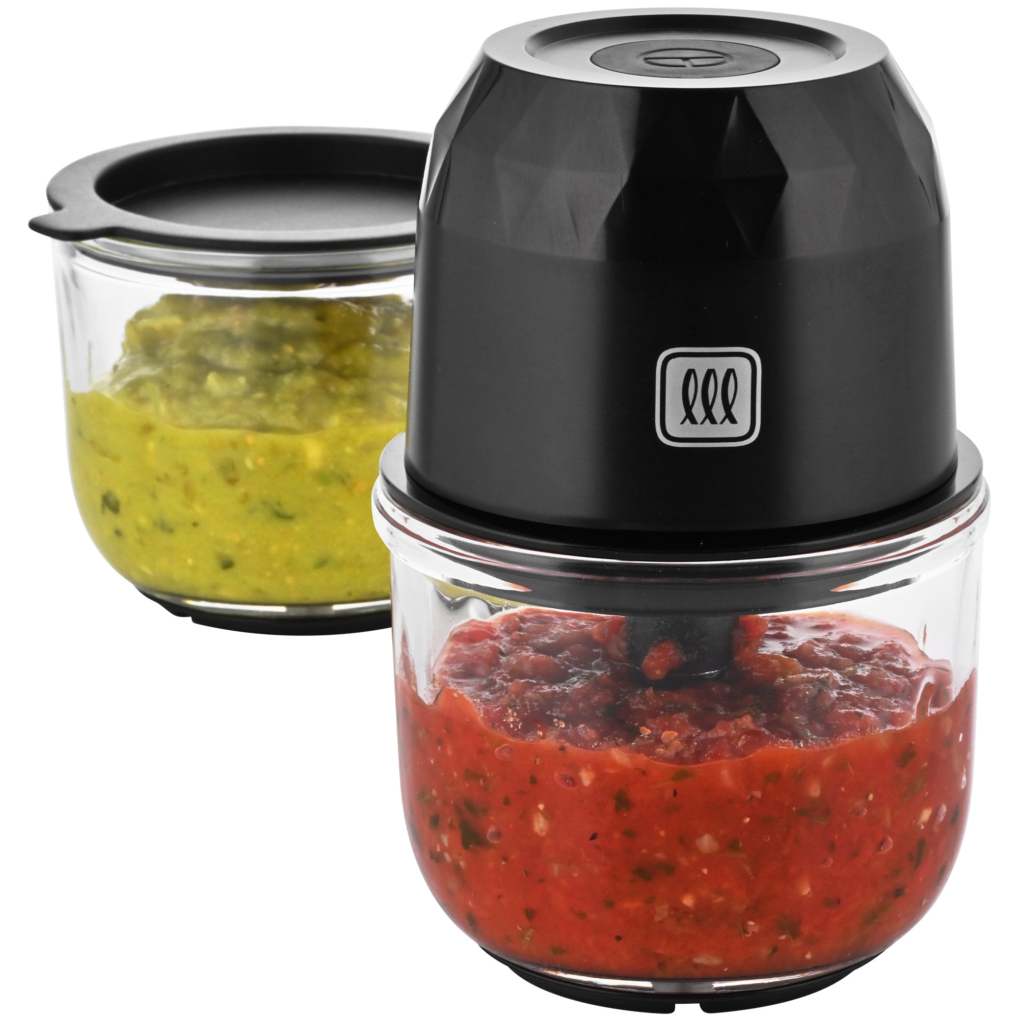 The 1 Cup Cordless Mini Chopper from Toastmaster is perfect for blending and chopping salsas, dressings, dips, nuts and more. The small but mighty chopper features a glass chopping bowl and stainless steel blades for long term durability. The locking lid ensures safety--the chopper will not operate if the lid is positioned incorrectly. Easy one touch, pulse operation allows the user total control. It features an extra glass storage bowl with lid, rechargeable battery, and a USB-charging port.