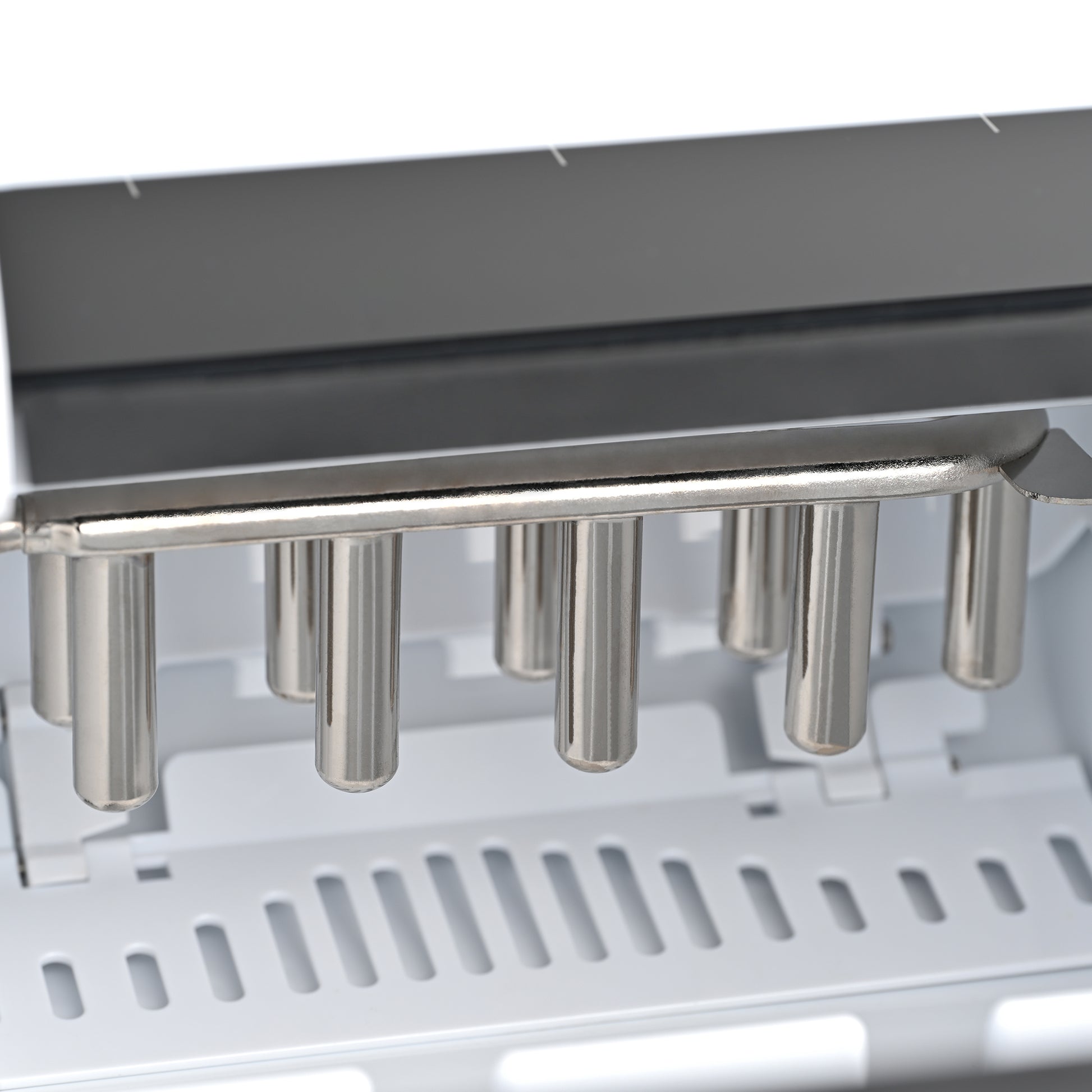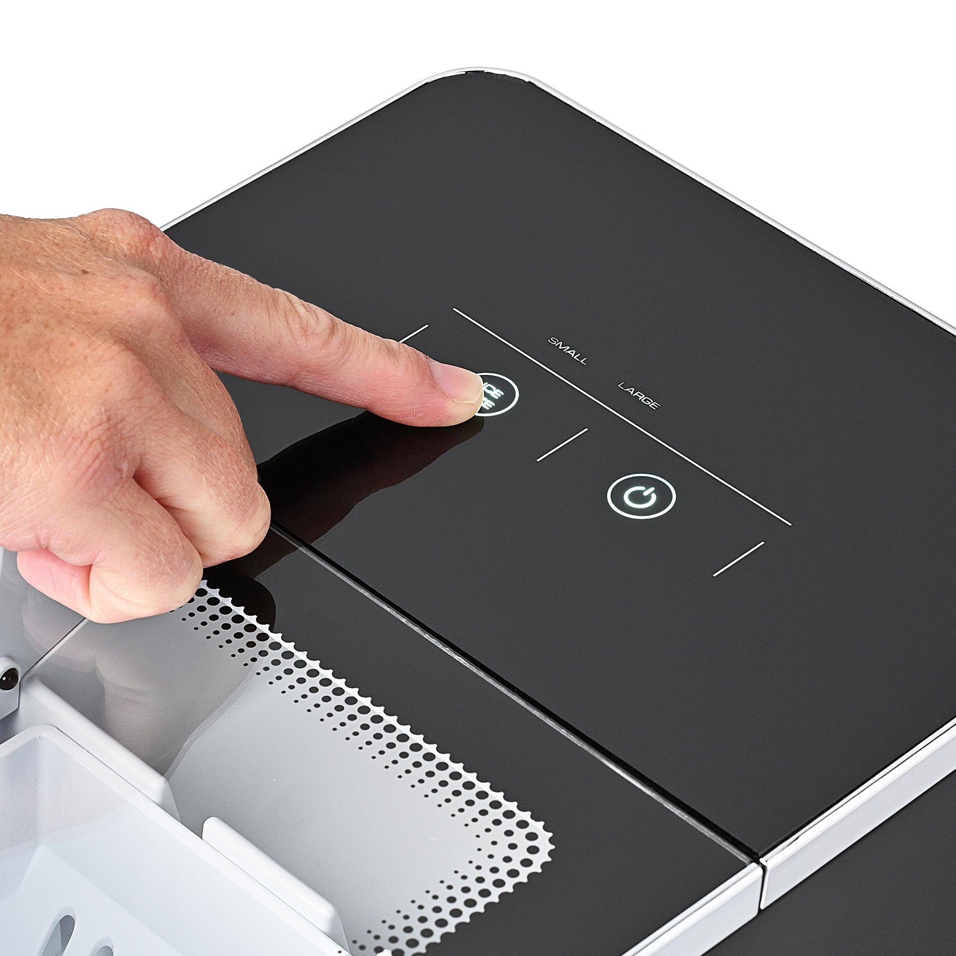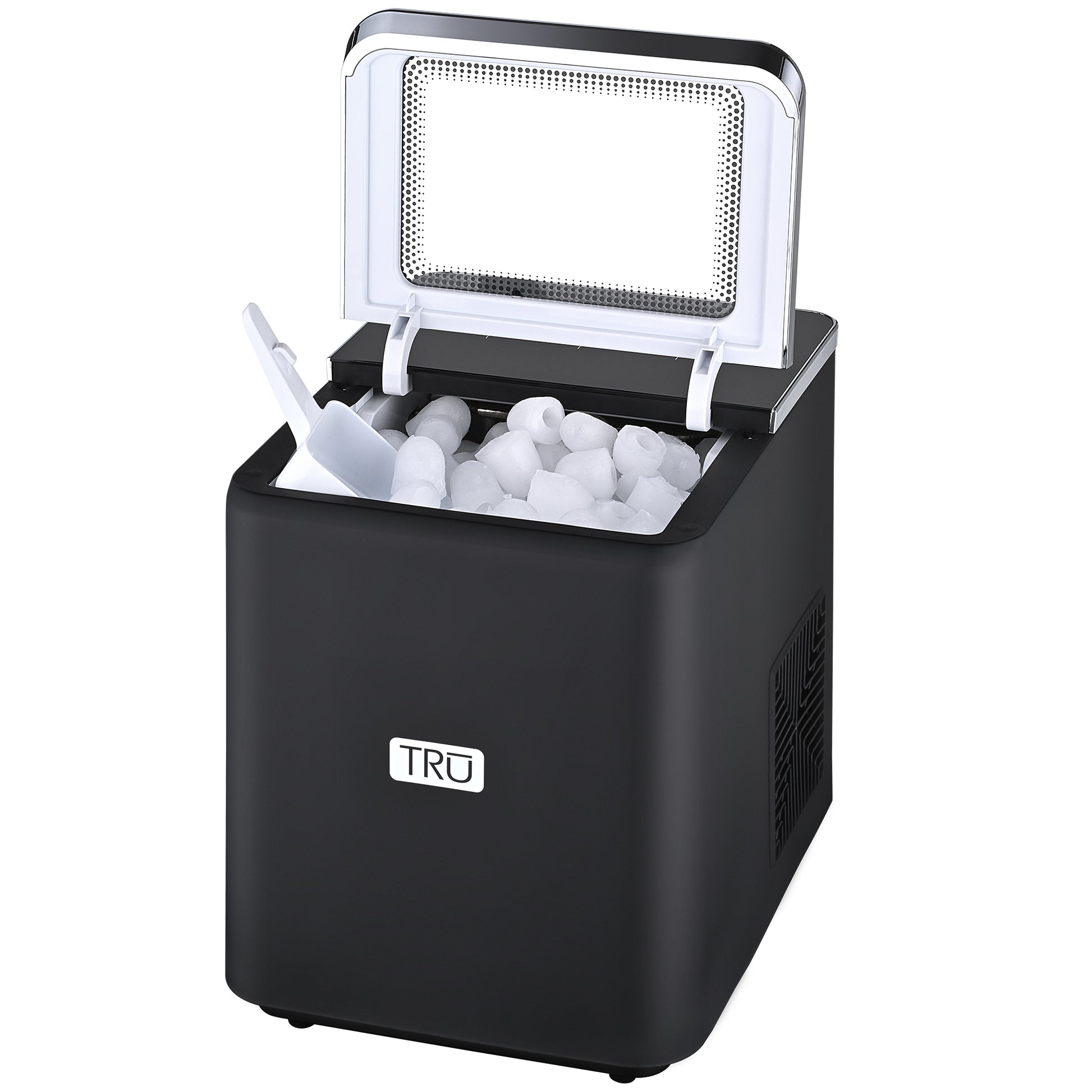 Elevate your entertaining experience with the TRU Countertop Ice Maker. Enjoy the first batch of fresh ice in just 6 minutes, with enough production for 8-10 drinks per hour and 26 pounds of ice in a day. Serve icy, cold drinks with the option of small or large bullet-shaped ice cubes. Featuring a sleek glass design and touch screen controls, this compact and portable ice maker is the perfect addition to any countertop. Say goodbye to plastic ice molds that take hours to freeze, occupy valuable freezer space, and only make enough ice for 2-3 beverages. If you're a frequent party host or love to entertain, the TRU Countertop Ice Maker is your ideal beverage companion.